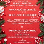 Au programme : 15h00 La Loup Barde présente : Les Contes de mon terroir à chaussettes. Trois contes clownesques intergénérationnels Crêpes, vin chaud…. 16H45 Présentation de contes par les adolescents et quelques morceaux de musique Karaoké Concours de déguisements Renseignements : Sandra ROTINAT 07-81-95-56-51